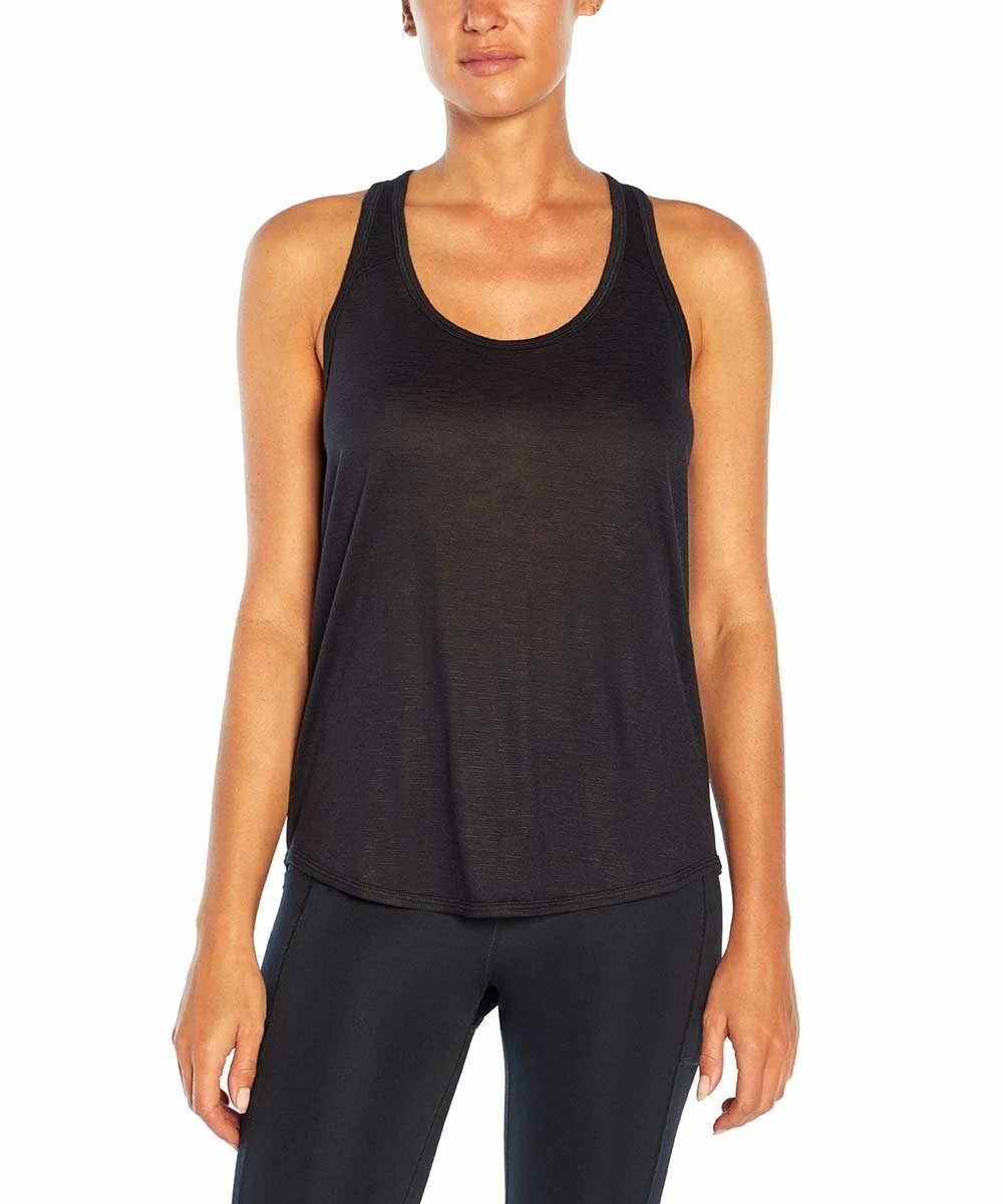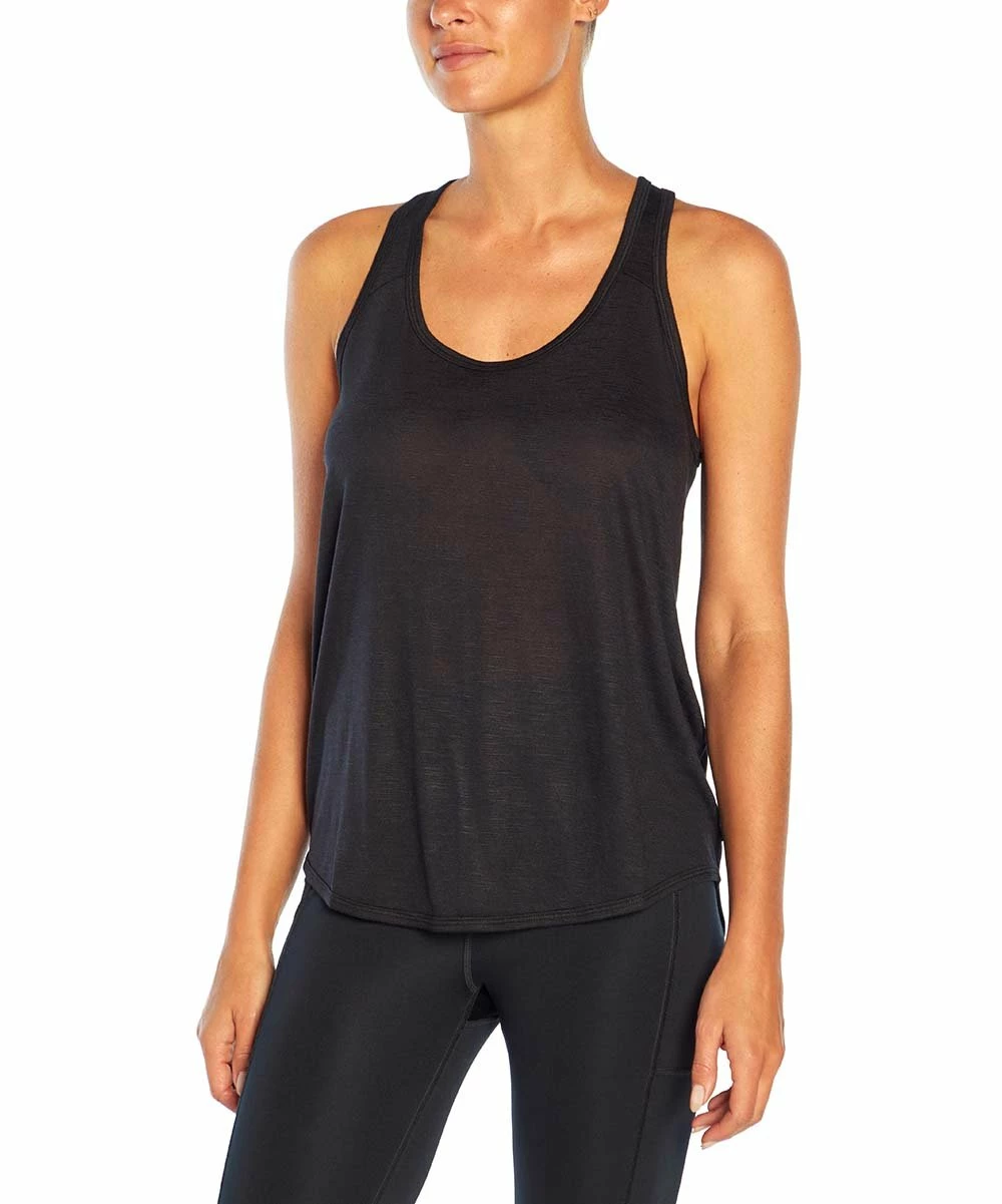 A relaxed fit and sporty racerback design make this tank a comfy, stylish and practical pick for your active wardrobe. Scoop neck and back pleat details.