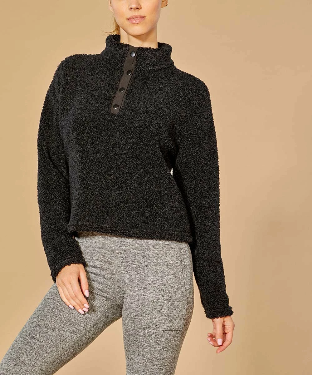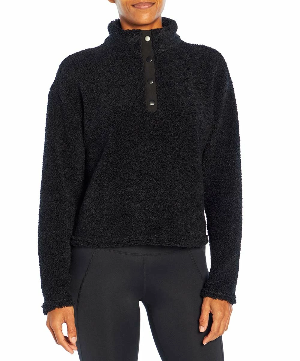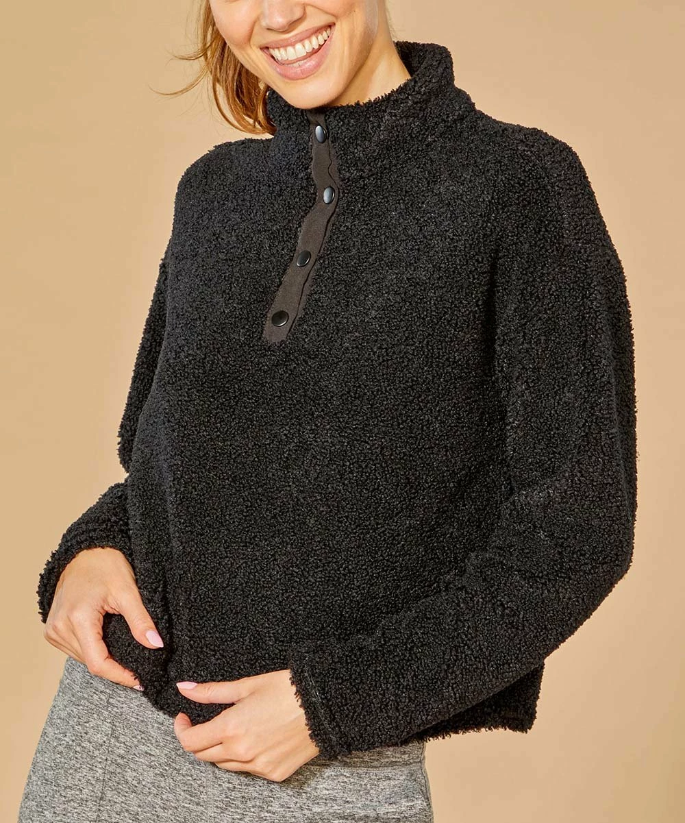 This comfy pullover features a woven, button-up placket, dropped armholes and a cozy sherpa fabric.