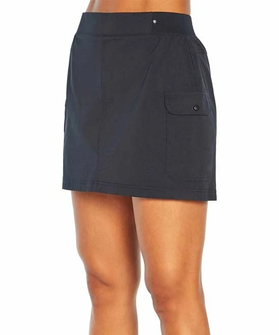 This solid-color skort is made with stretchy nylon-blend fabric with back-ribbed elastic waistband and snap side pockets.