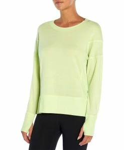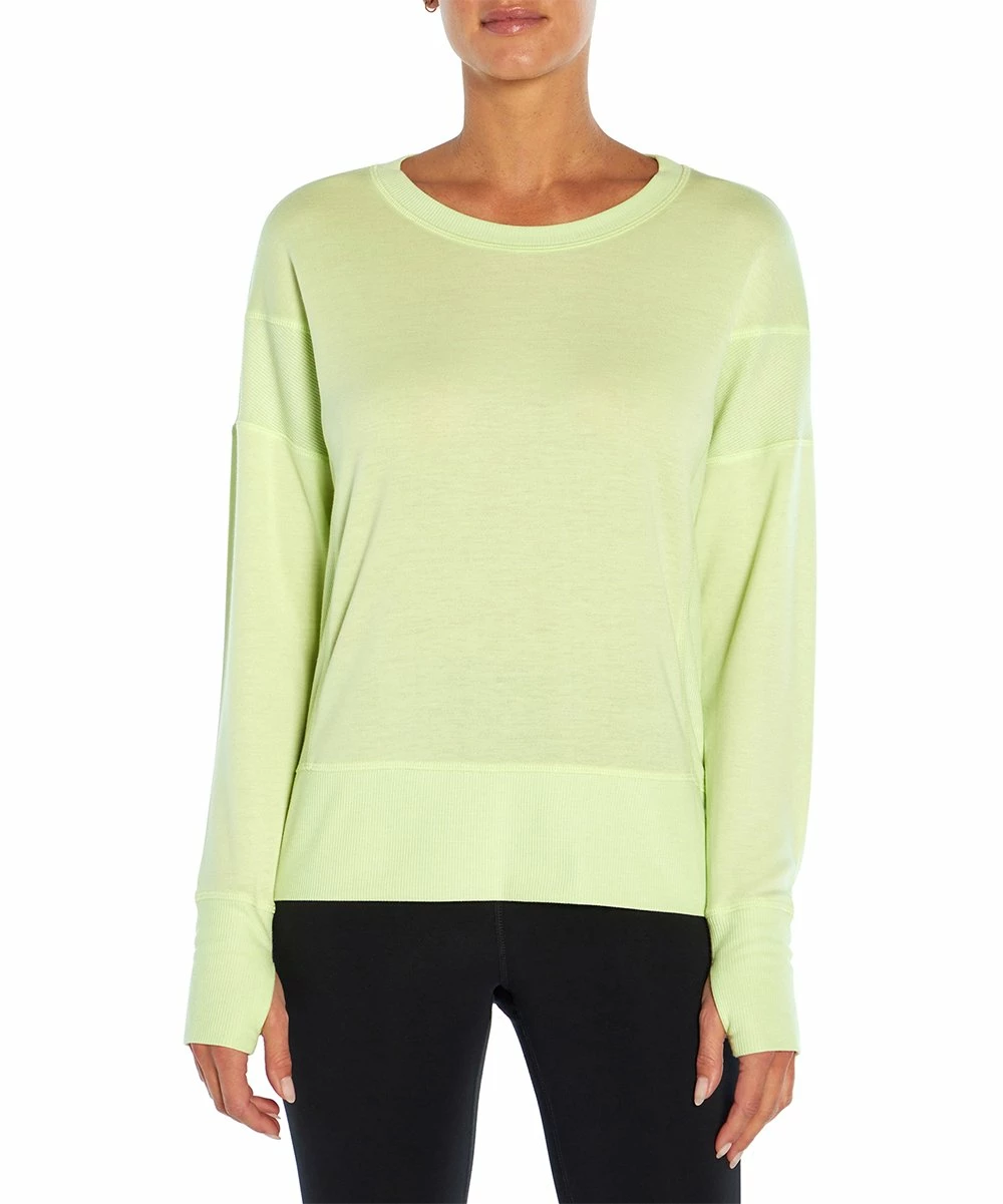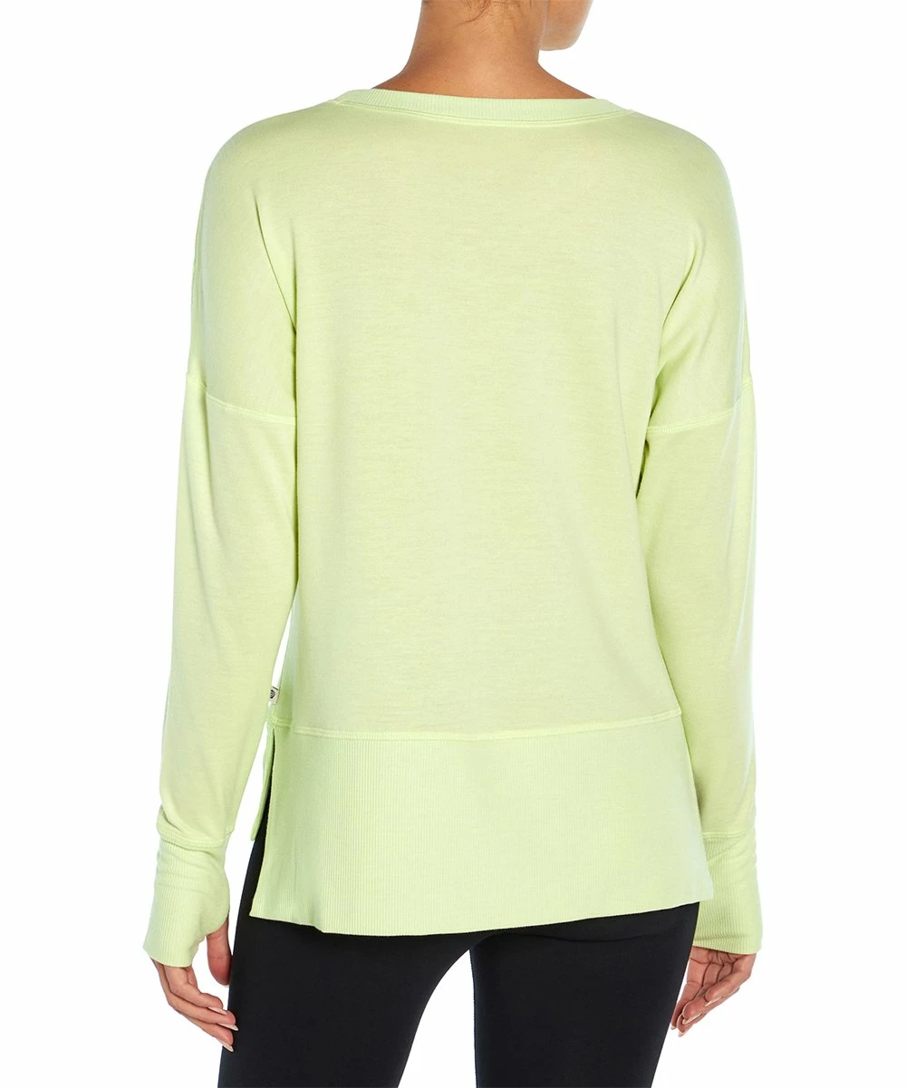 This solid-color pullover features French terry-knit fabric with ribbed panel detailing, hi-low hem and long sleeves with thumbholes.