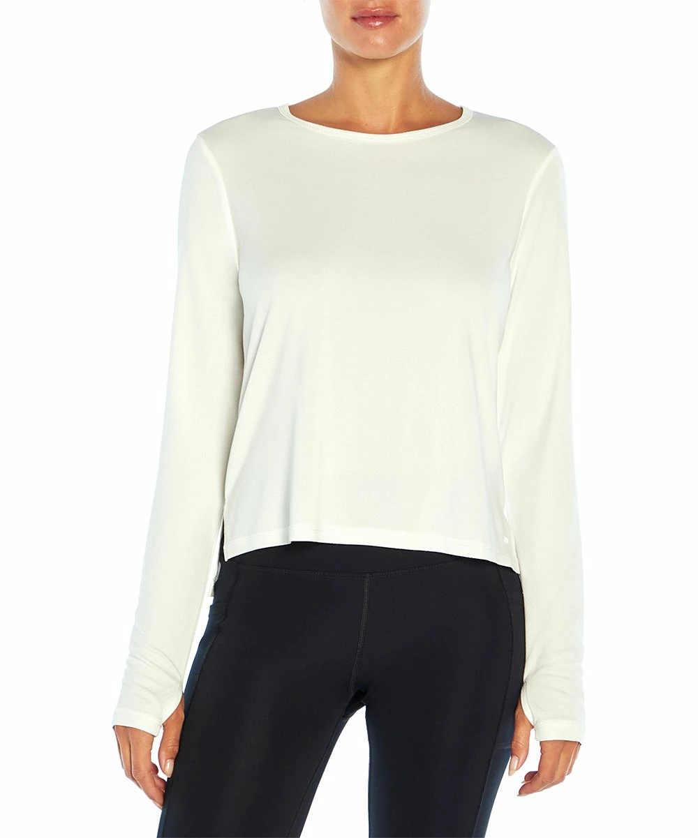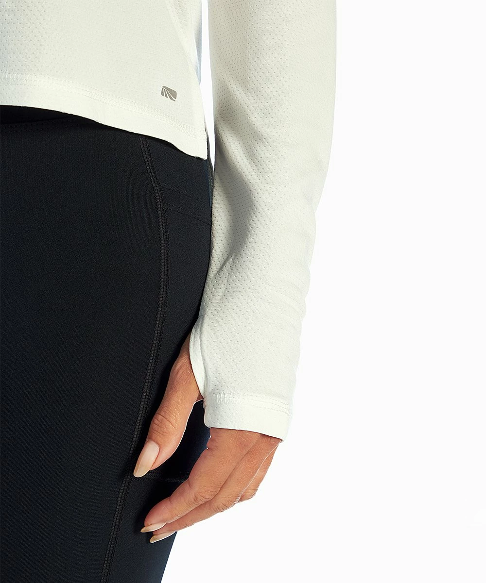 Long-sleeve top featuring a classic crewneck collar and convenient thumbholes.