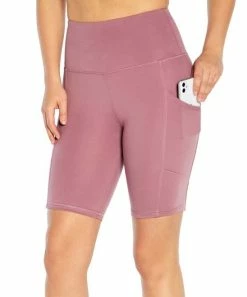 These solid-color bermuda bike shorts feature stretchy moisture-wicking fabric with a wide tummy control band and side phone pocket.