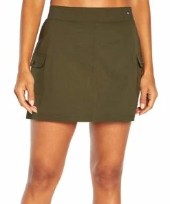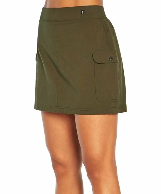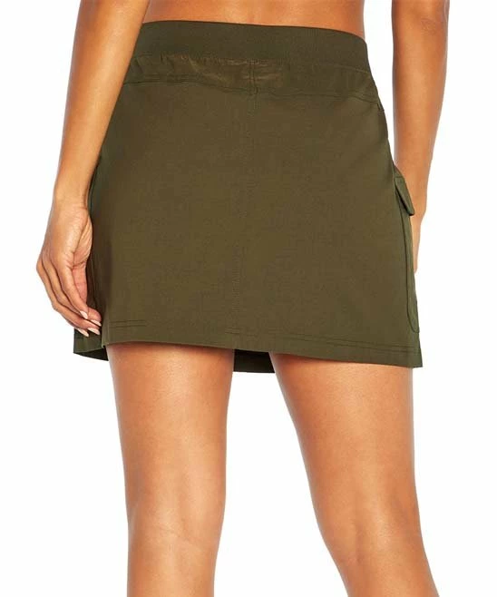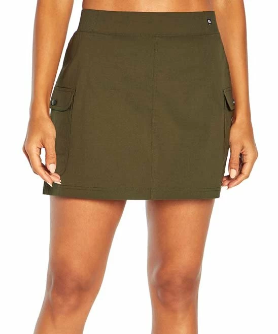 This solid-color skort is made with stretchy nylon-blend fabric with back-ribbed elastic waistband and snap side pockets.