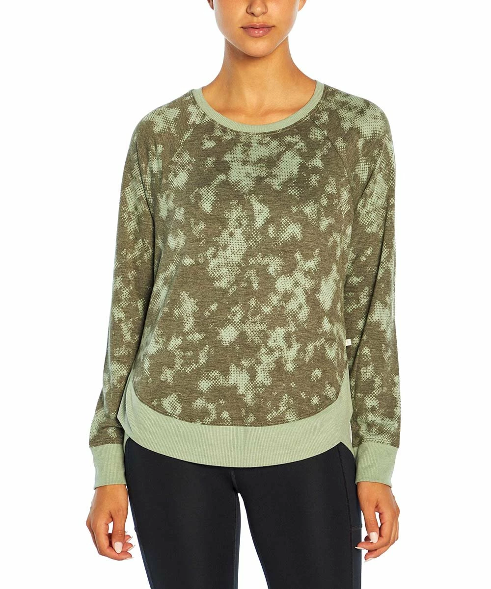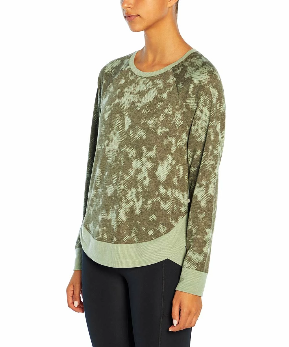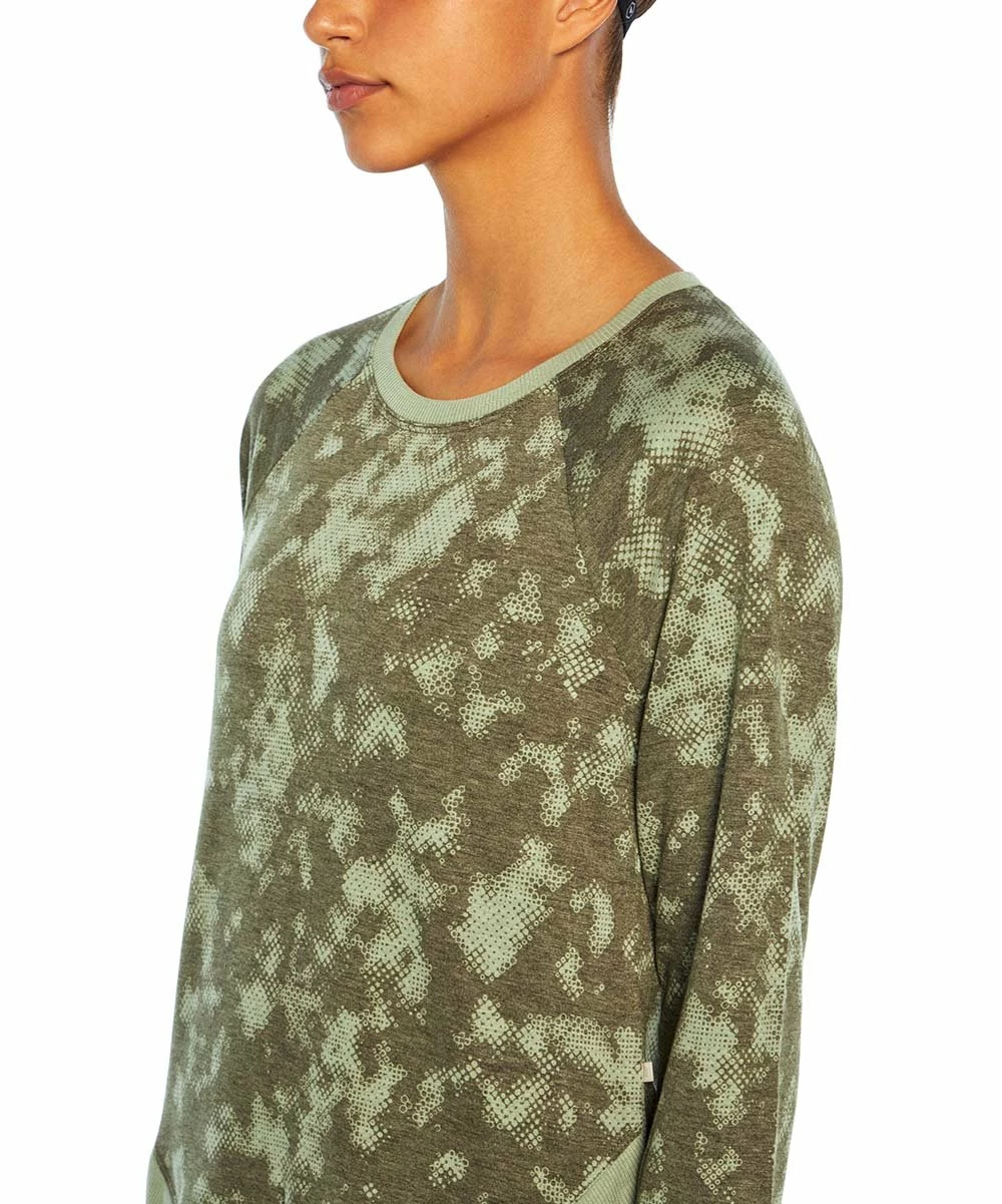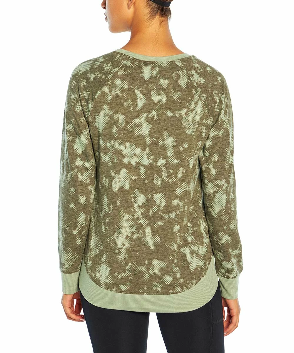 After workouts or on lounge days, slip into this scoop neck pullover designed with a subtle tulip hem and an abstract camo print. Generous length in the back drapes effortlessly over your favorite leggings.