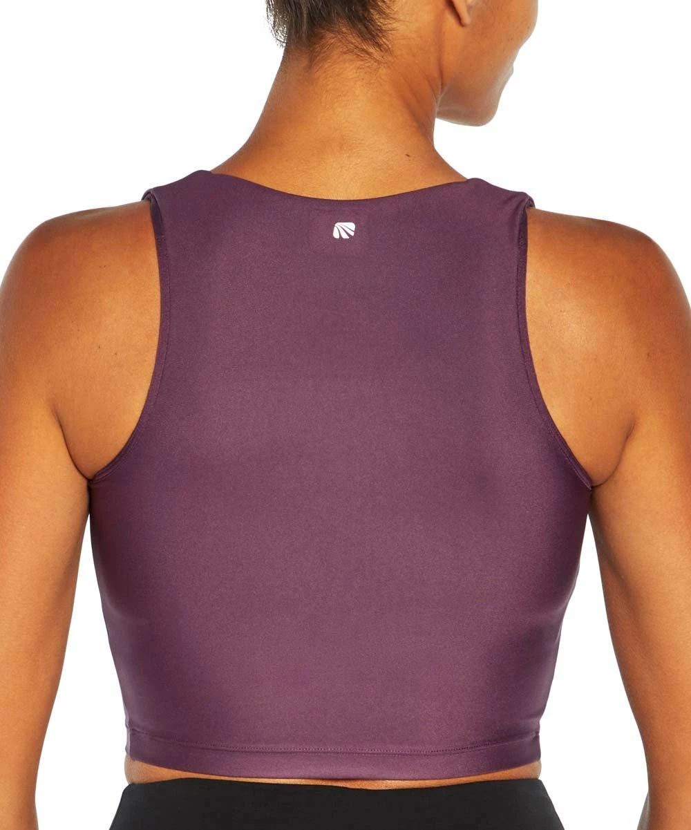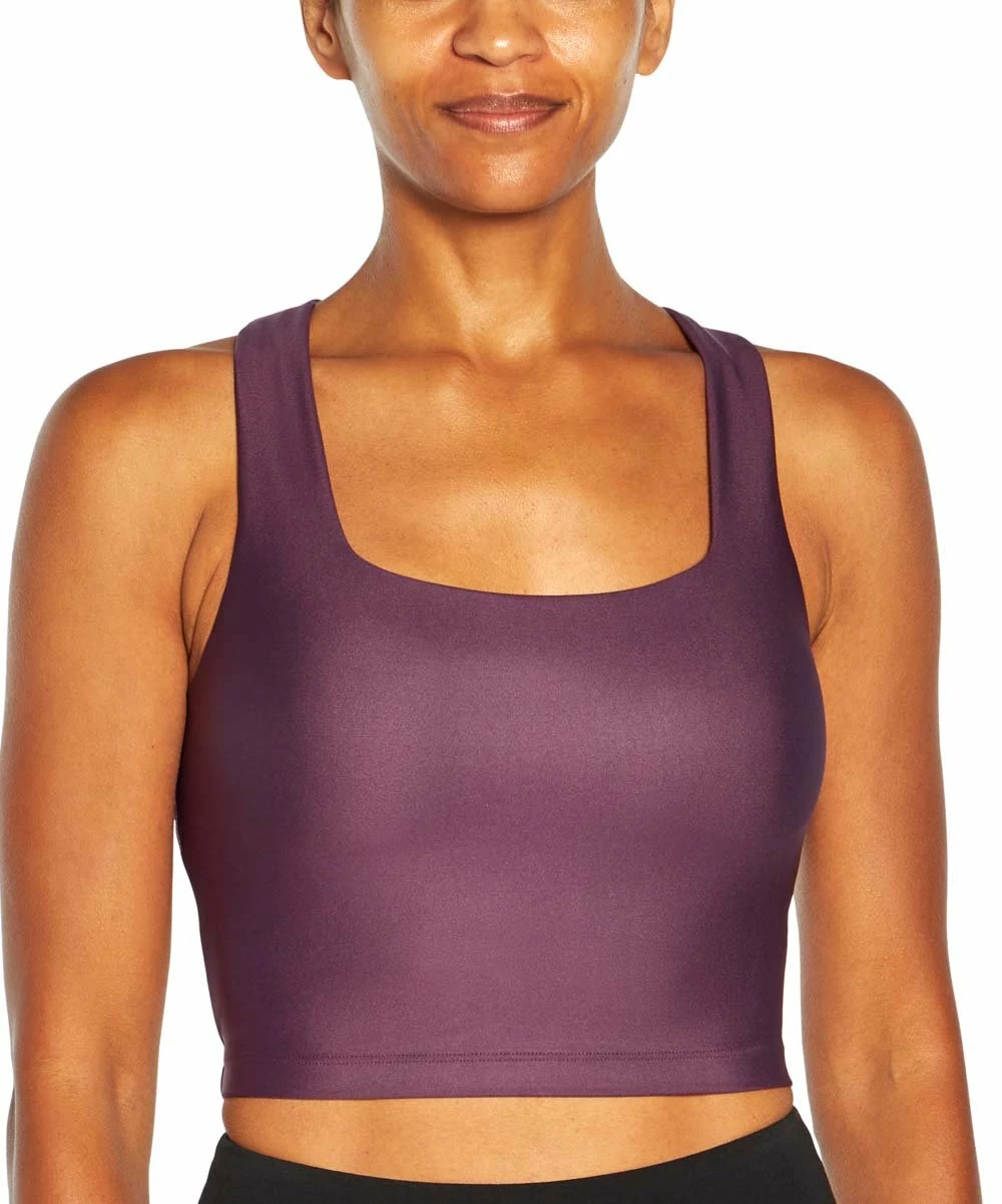 The glossy fabric gives this square-neck sports bra a flattering profile while the stretch-enhanced fabric creates a comfortable fit. Dry-wik finish and inner shelf bra.