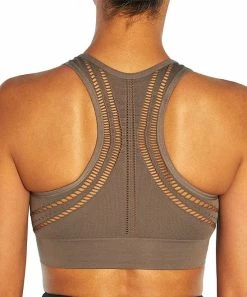 Get both style and support with this sports bra that features a neutral solid color and lace-style cutout accents on the back.